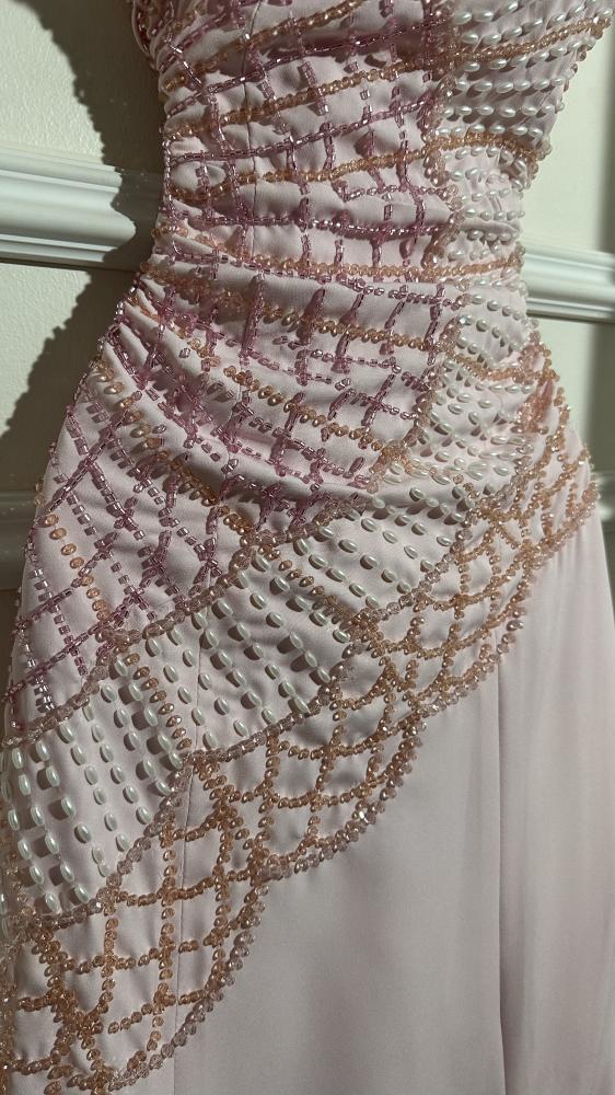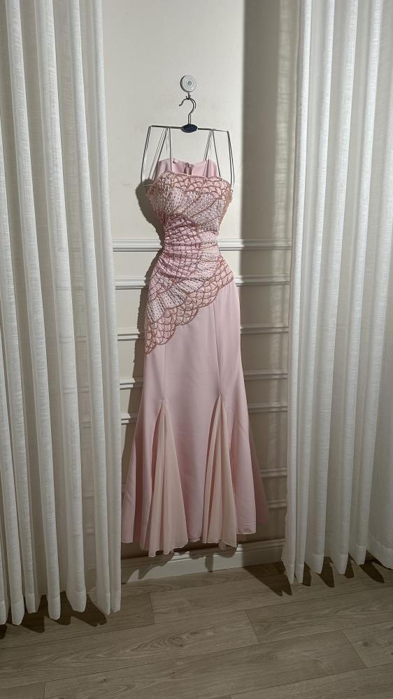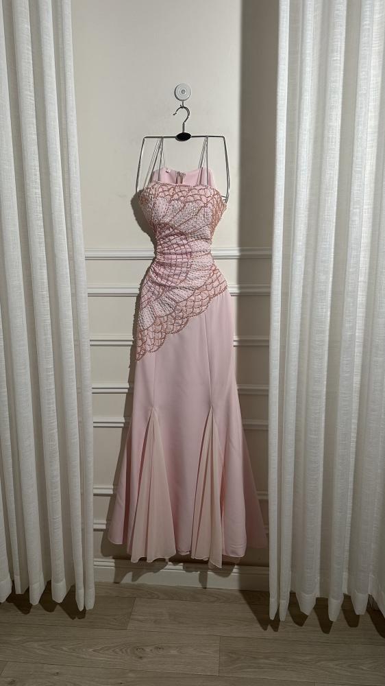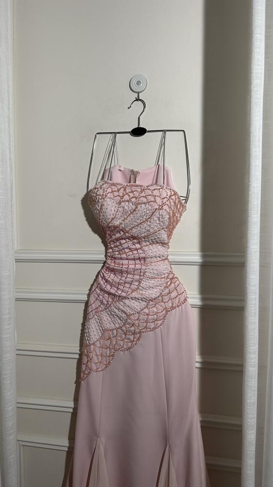 "فستان سهرة طويل أنيق بلون وردي ناعم يميل للخربزي ، مصمم بقصة حورية البحر الجذابة التي تبرز منحنيات الجسم بأناقة ثم تتسع بنعومة من الركبة.; يتميز الصدر بتصميم حمالات رفيعة أنيقة، ويزدان بالكامل بتطريزات دقيقة ومتقنة على شكل دوائر متشابكة أو أنماط هندسية مستوحاة من الدانتيل، بلون ذهبي وردي لامع أو بيج فاتح، مما يضفي عليه لمسة من الفخامة والرقي.; تتواصل هذه التطريزات البراقة بشكل فني على طول الجانب الأيمن من منطقة الخصر والورك، لتشكل لوحة فنية ساحرة تتلألأ مع كل حركة.; الجزء السفلي من الفستان مصنوع من قماش ناعم وانسيابي، ربما كريب أو ساتان مطفأ اللمعة، بينما تتميز أطراف التنورة من الأسفل بثنيات أو طبقات خفيفة من قماش أفتح درجة أو بلون بيج فاتح، مما يضيف حركة وجاذبية للفستان.; هذا الفستان مثالي للمناسبات الخاصة والسهرات الراقية، حيث يجمع بين الأناقة الكلاسيكية والتفاصيل العصرية الفاخرة.; "